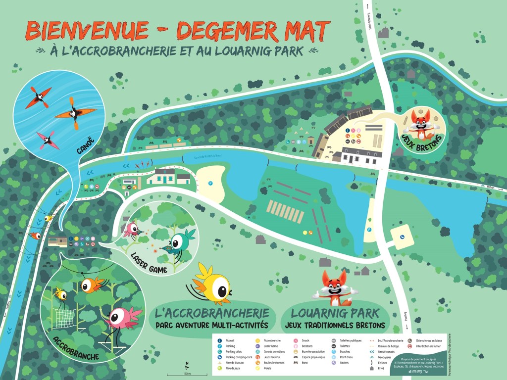 Vous y trouverez nos jeux traditionnels bretons et du monde ainsi que de l’accrobranche, du laser game en forêt et de la location de canoës. Vous pouvez y passer la nuit en bivouac ou camping-car et manger un morceau au bord du canal de Nantes à Brest.